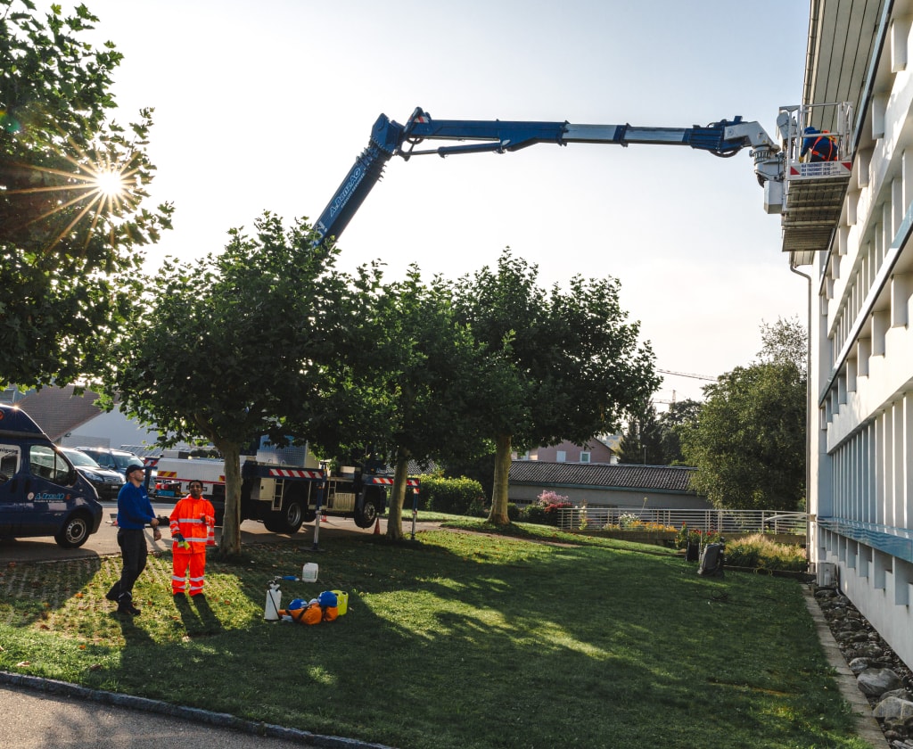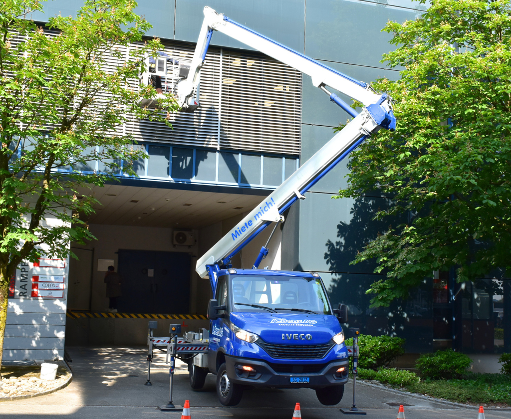 Unsere Hebebühne mit maximaler Arbeitshöhe von 38 m ist ohne Totpunkte universell einsetzbar. Sie eignet sich nebst der Nutzung an Fassaden auch sehr gut für den Einsatz unterhalb von Fahrbahnen, für Inspektionen an Brücken und Viadukten, für Dacharbeiten etc.